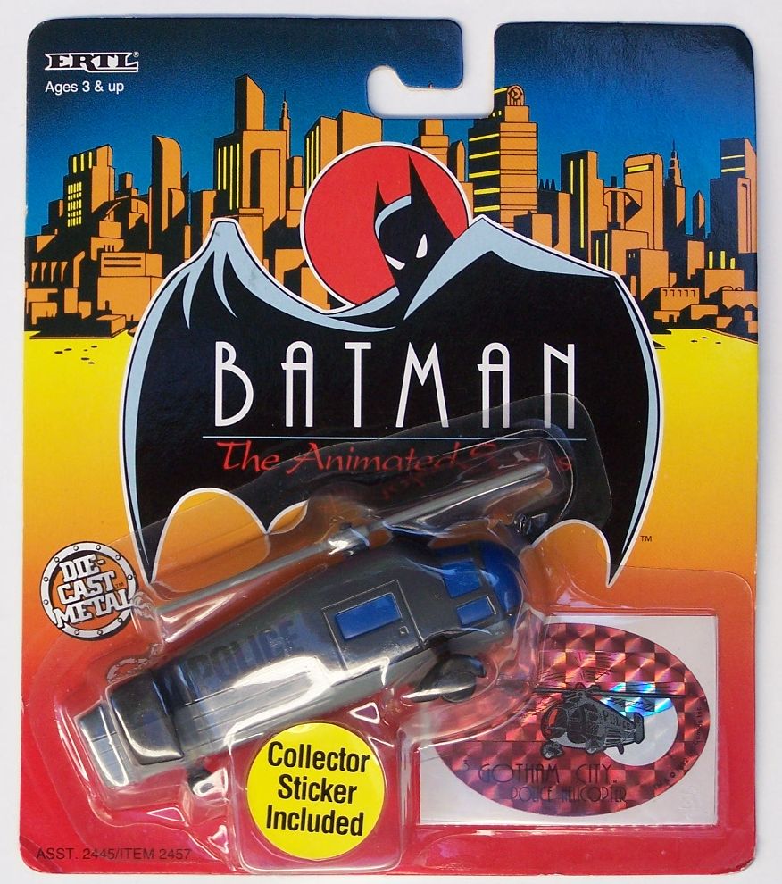 Ertl The 1/64 scale Gotham City Police Helicopter, including a Collector Sticker. Measures 4" long and 1 3/4" tall.