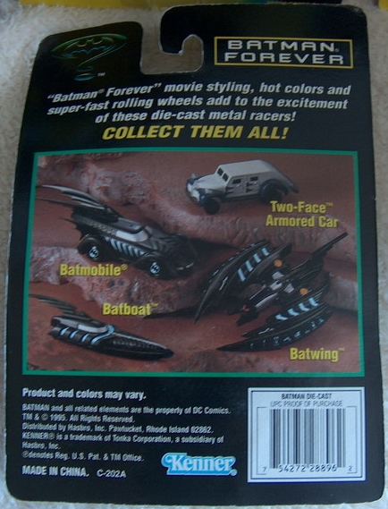 Kenner "Batman Forever" movie styling, hot colors and super-fast rolling wheels add to the excitement of these die-cast metal cars! CARDBACK