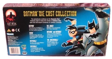 The adventures continue as the Dynamic Duo tirelessly fight to keep the streets of Gotham City safe from the bizarre schemes of ruthless criminals. BOX BACKSIDE INFO Batman The infamous crimefigher is armed and ready to confront the most powerful adversary. Robin This courageous sidekick assists the Caped Crusader in the battle against evil. Batmobile Exclusive from the Batman animated movie. Batmobile The Batmobile from The New Batman Adventures. The Joker Batman's most unpredictable foe is truly a wild card. Batwing & Batboat High tech transporters. The Jokermobile The Joker takes to the streets of Gotham City in his special vehicle, but Batman is never far behind!