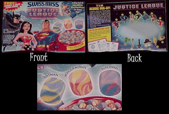 Swiss Miss Hot Cocoa Mix contains eight 1 ounce envelopes of cocoa and eight 0.2 ounce envelopes of marshmallows. Marshmallows colors represent Batman, Superman, and Wonder Woman.