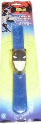 A blue snap-on wristband featuring a Batman case of 'Bat Bites'!